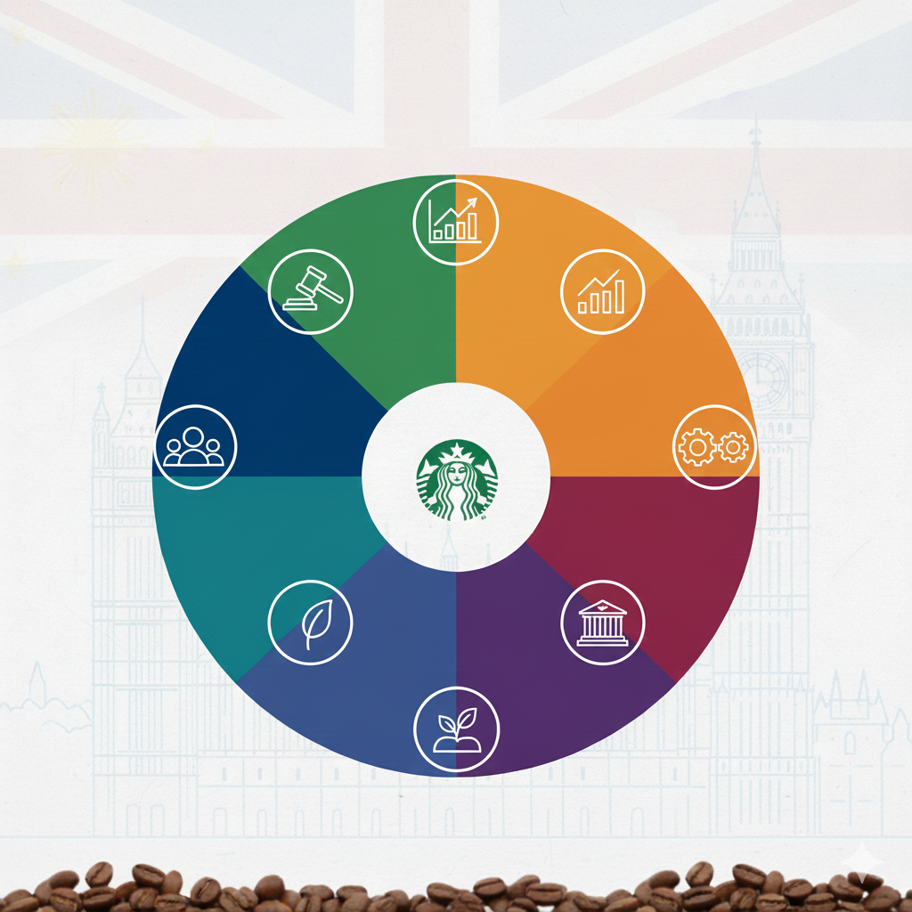 Environmental expectations in the UK are stringent, with strong public support for sustainability, plastic reduction, and carbon emission goals. Starbucks must maintain eco-friendly packaging, energy-efficient stores, and waste reduction initiatives to align with regulatory requirements and consumer values. Legally, Starbucks faces comprehensive regulations concerning food safety, employment, advertising, data protection, franchising, and competition laws. The strict legal framework demands consistent compliance, transparency, and strong corporate governance at all levels of operation. Also, read Pestle analysis of Starbucks here.